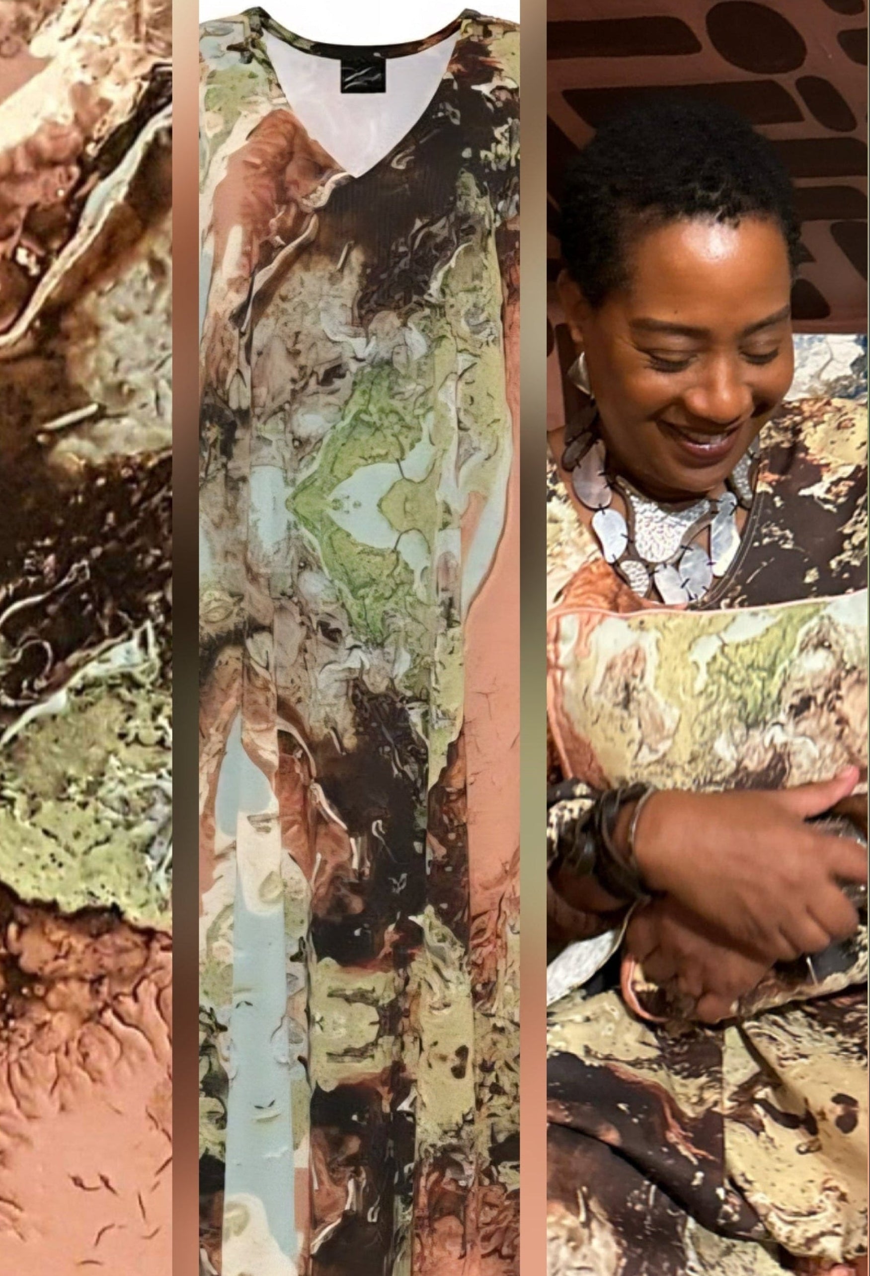 ABSTRACT ART IS A NON-REPRESENTATIONAL ART FORM. A FREEDOM. OUT OF KHARACTER, RESIDES IN THE SPACE OF FREEDOM AND VISUAL EXPRESSION. A SIGN LANGUAGE IN DESIGN, OUT OF KHARACTER CREATIONS ARE AUTHENTIC ABSTRACT PAINTINGS REIMAGINED INTO WEARABLE ART and beyond. The collection of selected pieces are rich, absorbing and stirring with boundless interpretations. Implicit in being "Out of Kharacter" is the ability to communicate through wordless expression, a distinct and invaluable art form AS WELL AS PURPOSE. This approach embraces the power of visual storytelling and self-representation without relying on language. By moving beyond words, each piece becomes a silent yet profound stylish statement, allowing the wearer to express individuality and embracing that they too are a LIVING WORK OF ART.